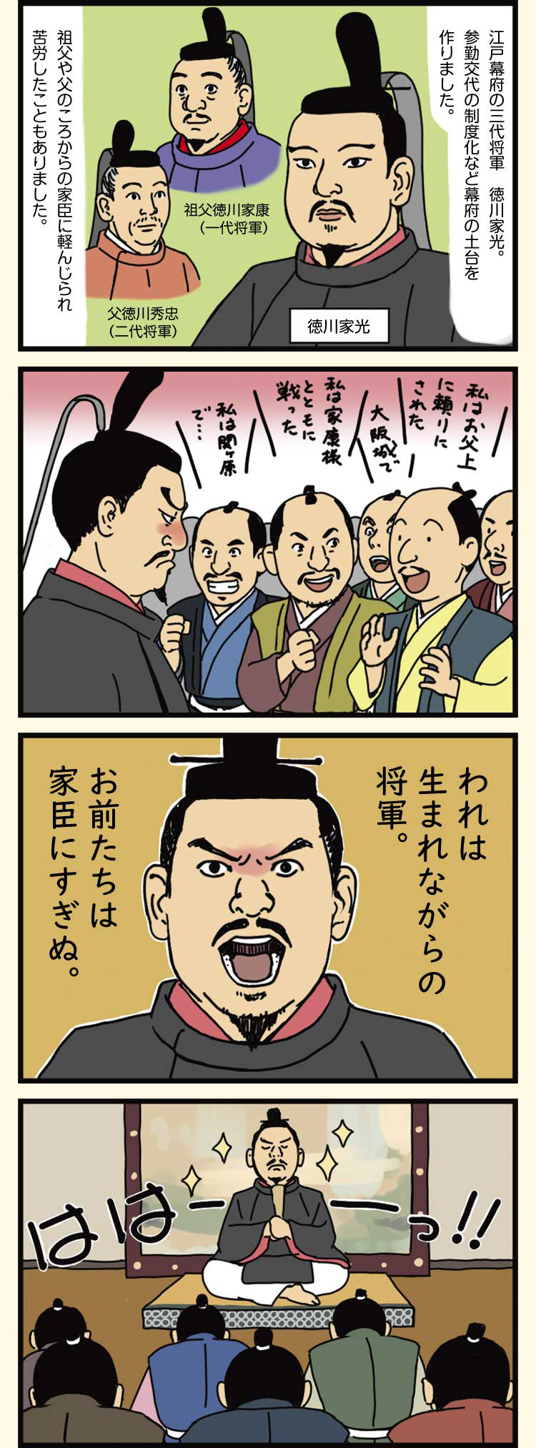 1623年、3代目の将軍となる。参勤交代の制度を定めたり、御触書(おふれがき)を出して百姓を統制したりする。また長崎に出島をつくるなど、幕府の力を強める。1641年鎖国を完成させる。